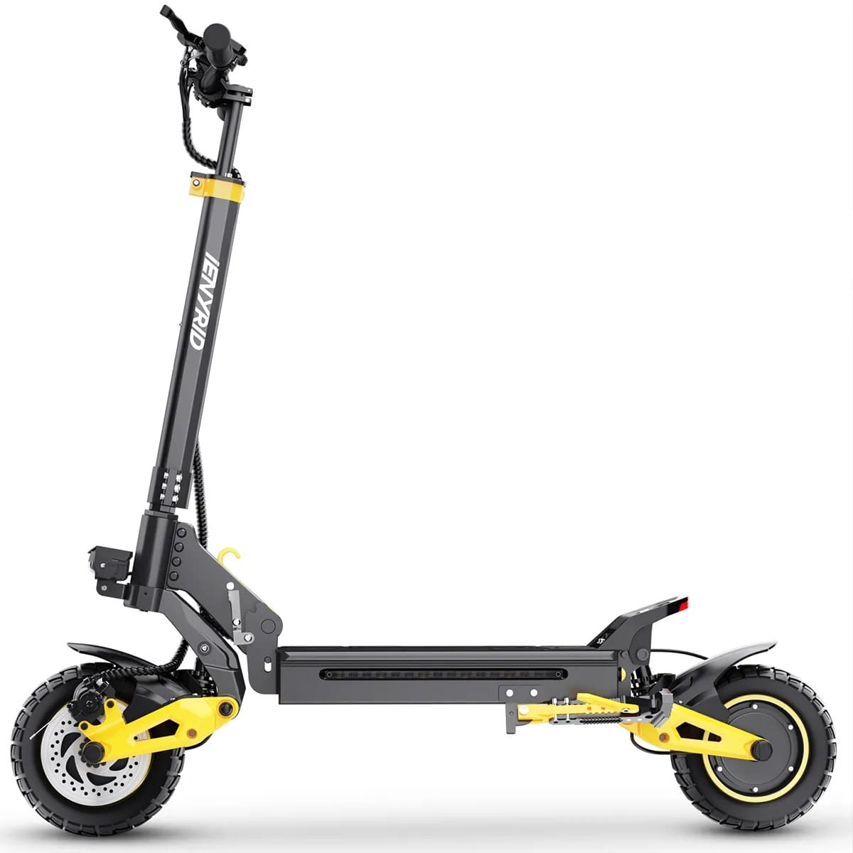 L’iENYRID ES1 est équipée de pneus tout-terrain de 10 pouces, conçus pour offrir une traction optimale sur une grande variété de surfaces. Leurs sculptures profondes assurent une excellente accroche sur les routes abîmées, les chemins de terre, les pavés ou le gravier. Même sur sol mouillé, la stabilité reste au rendez-vous. La conduite reste fluide et sans à-coup.