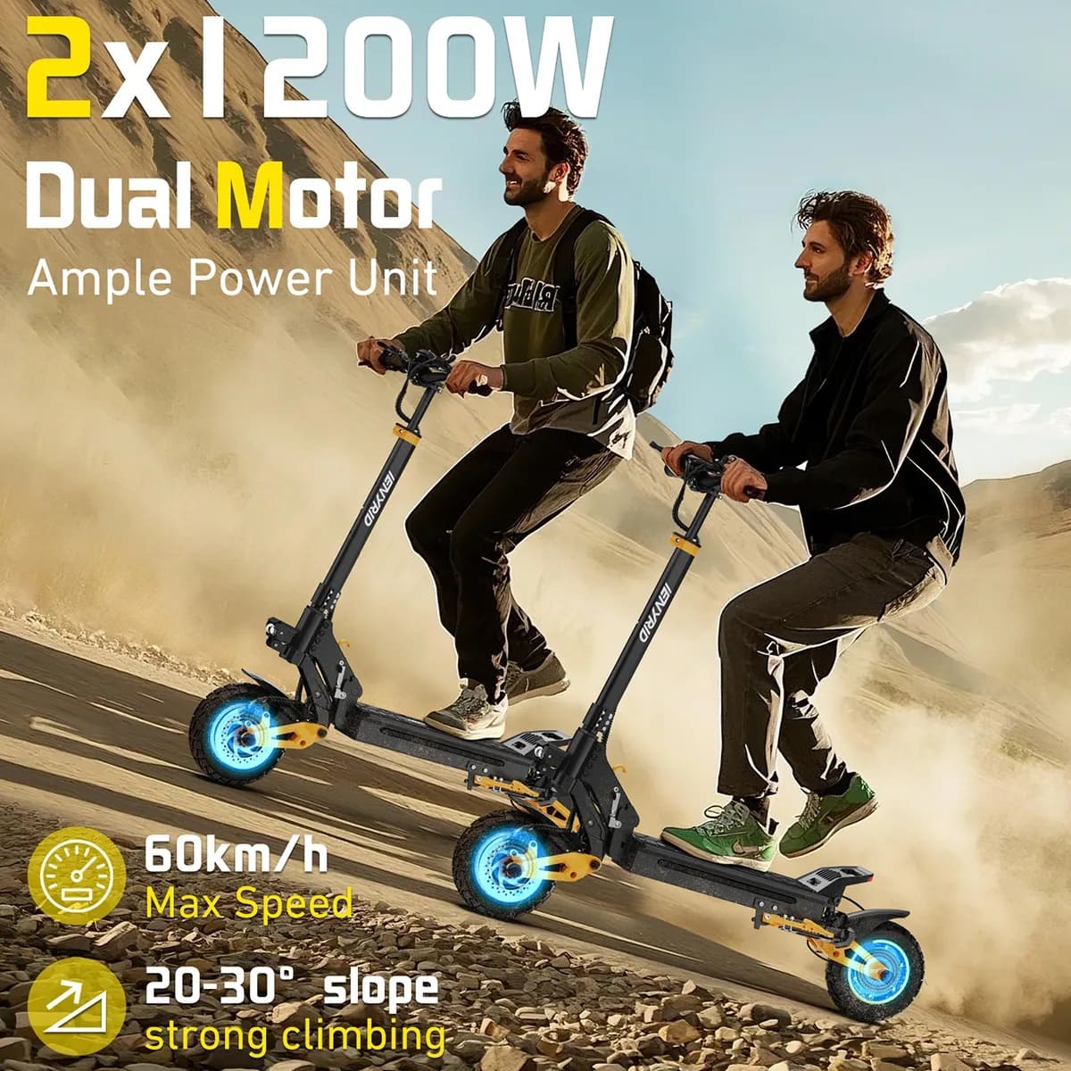IENYRID ES1 – Trottinette électrique tout-terrain – Double moteur 1200W – Autonomie 60 km – Vitesse 60 km/h – Suspension hydraulique